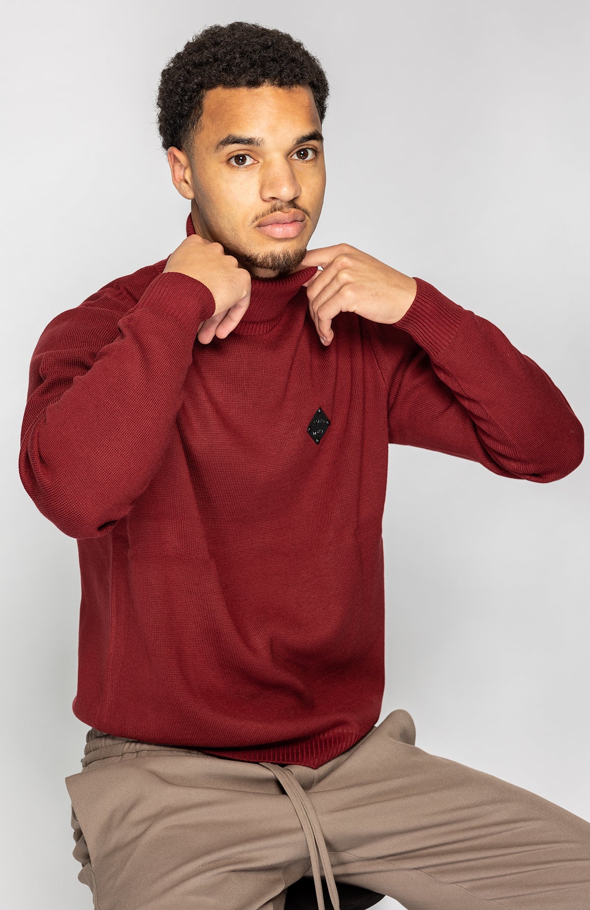 • Geribde kraag, mouwboorden en tailleband