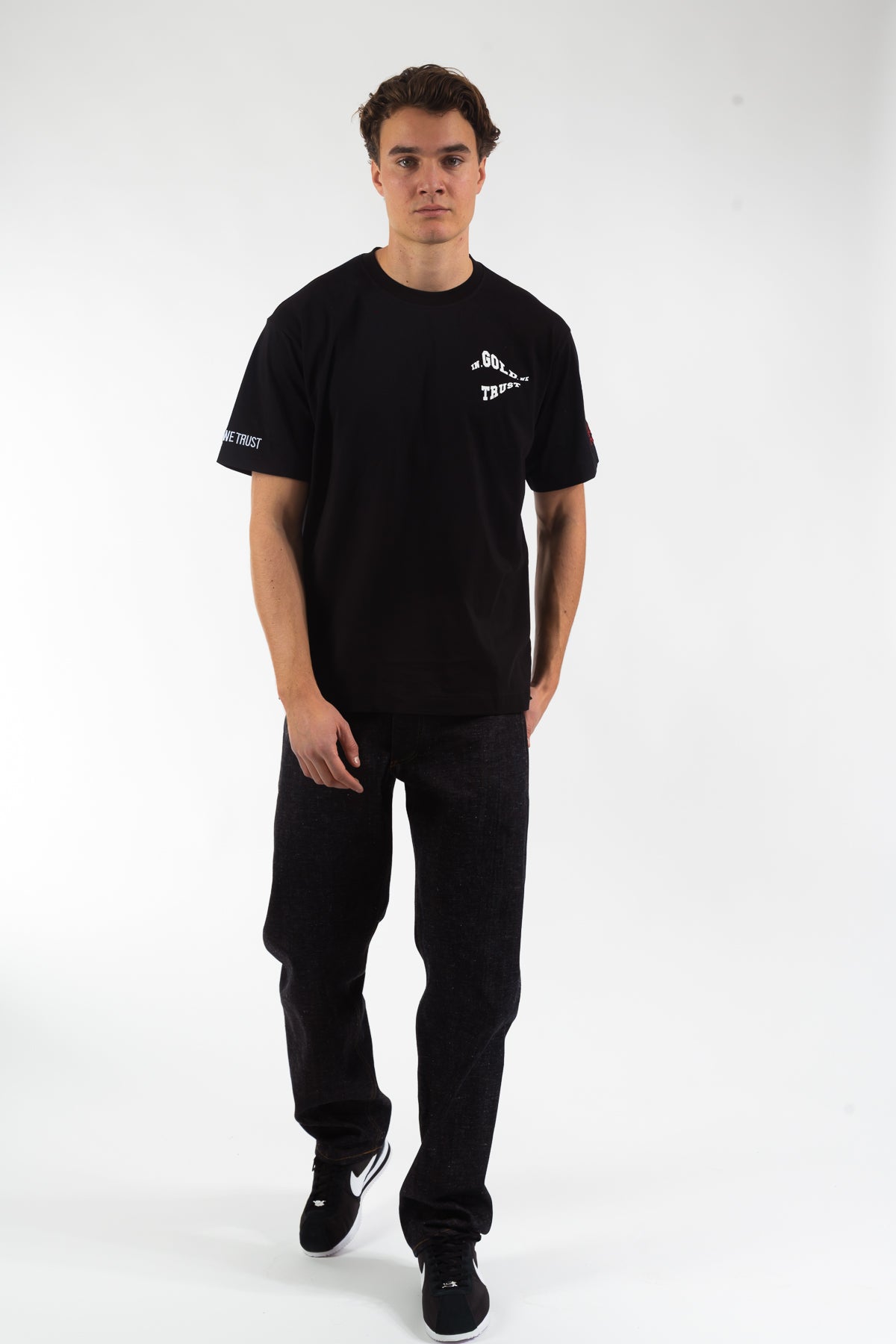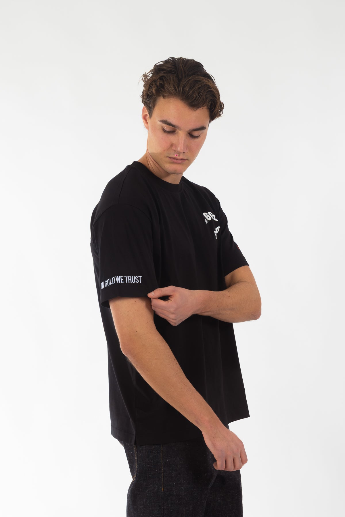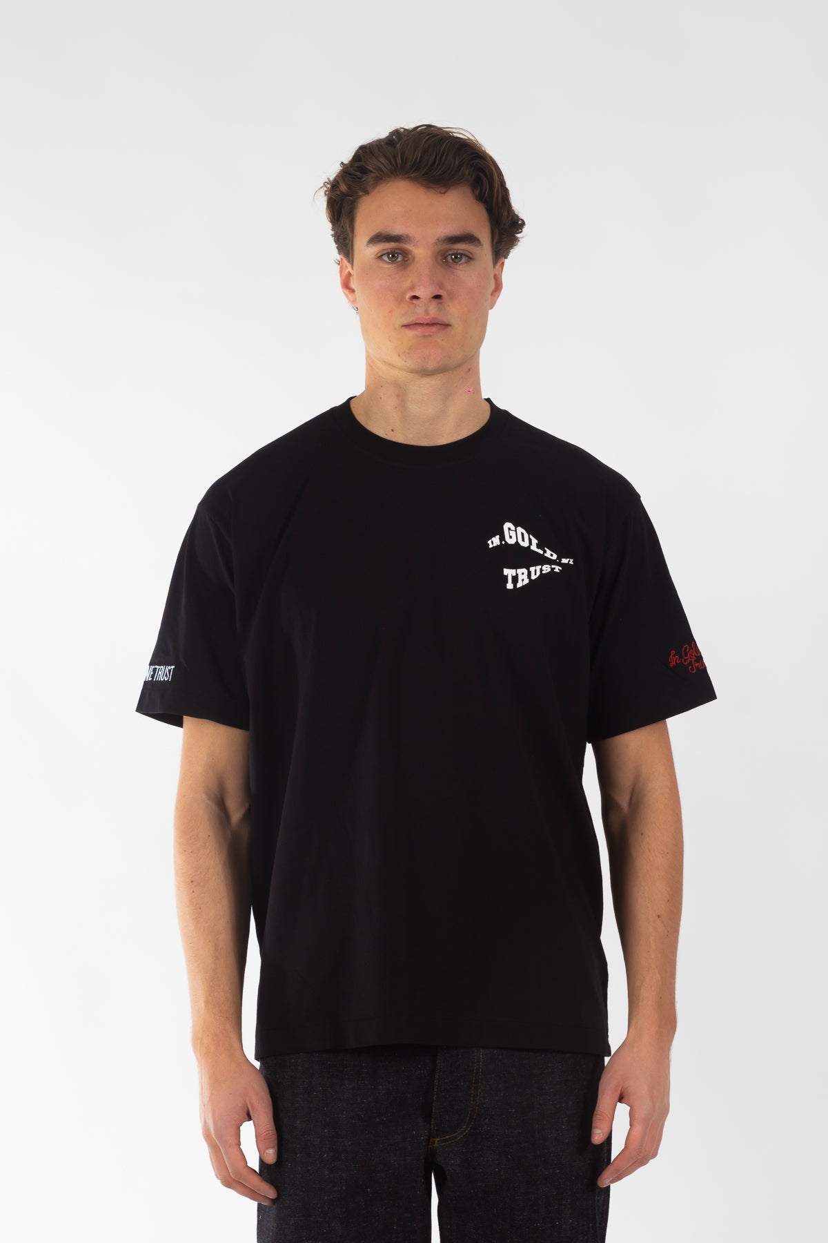T-shirt uit de nieuwe collectie, gemaakt van 100% katoen in een comfortabele loose fit. Voorzien van een golvend logo in hoogwaardige zeefdruk en onze kenmerkende borduursels op de mouwen. Tijdloos ontwerp, uitgevoerd in de originele kwaliteit waar In Gold We Trust bekendstaat.