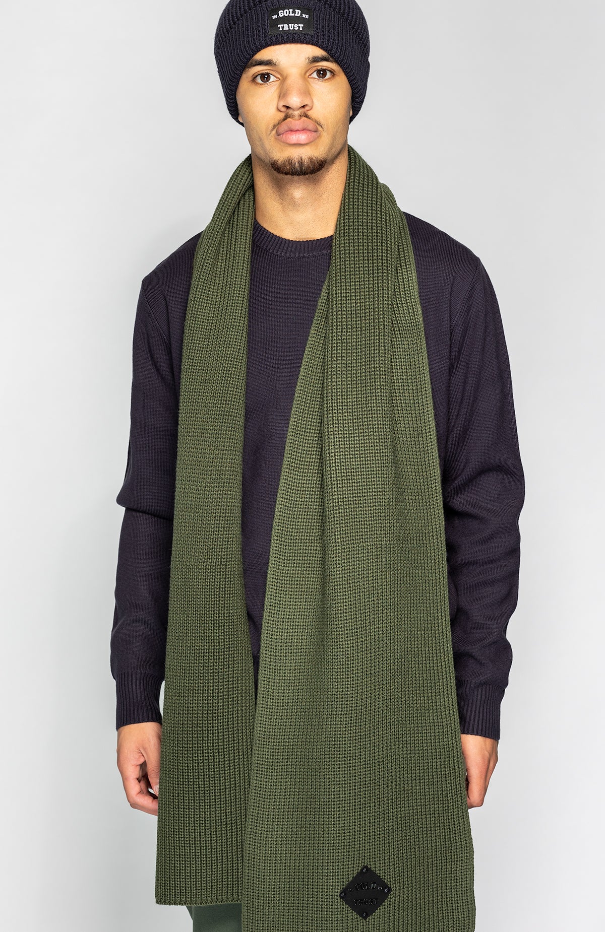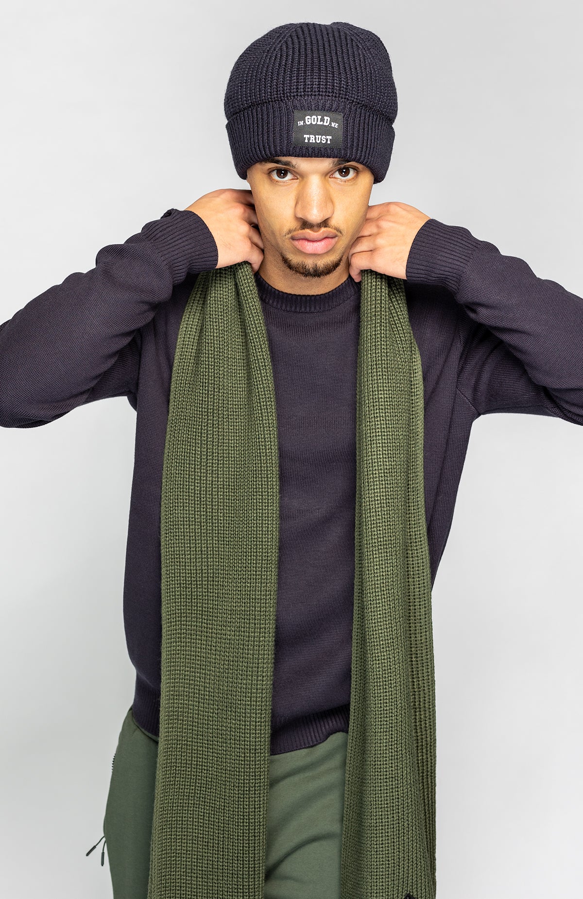 Introductie van de Plane Scarf in Duffle Bag. Gemaakt van acryl, het is breed uitlopend, met een zwart In Gold We Trust logo. Het perfecte accessoire om je IGWT-fit compleet te maken tijdens de koudere dagen.